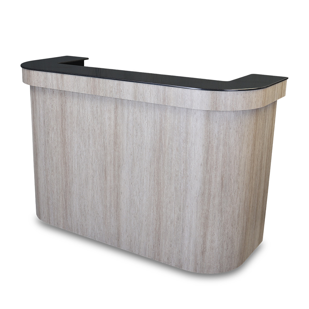 H.P.L. Mobile Bar (5 ft. length) – cabinet with rounded corners on front, “U” shaped Standard Solid Surface countertop, stainless steel work counter, sink and drain, two speed rails and three sets of glass rack holders. (6 ft. image shown)