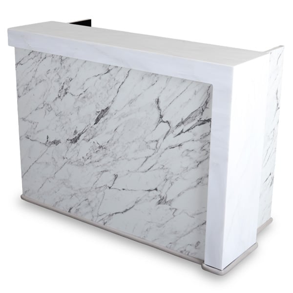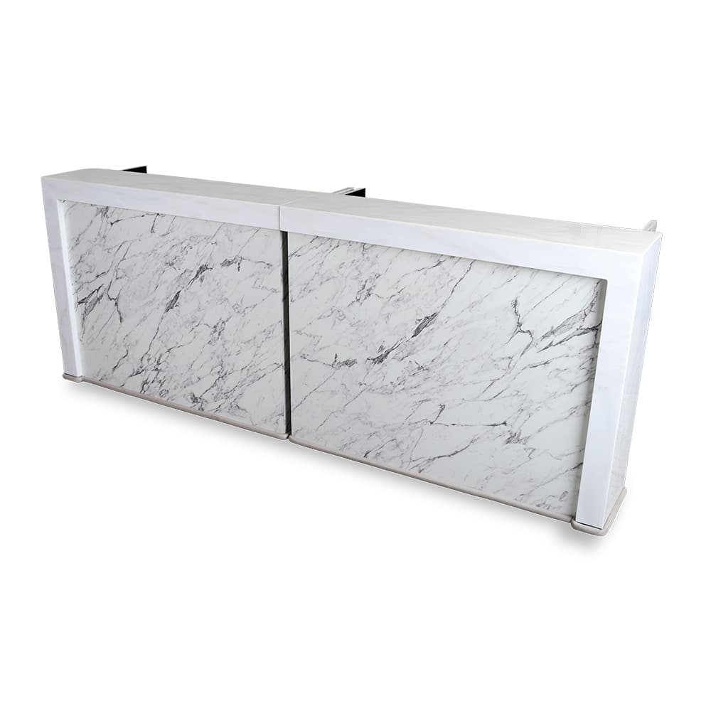 This bar features an Standard Solid Surface countertop with waterfall edge design and a full wrap around bumper for protection. The panels are made of a high pressure laminate finish and brushed stainless steel accents.