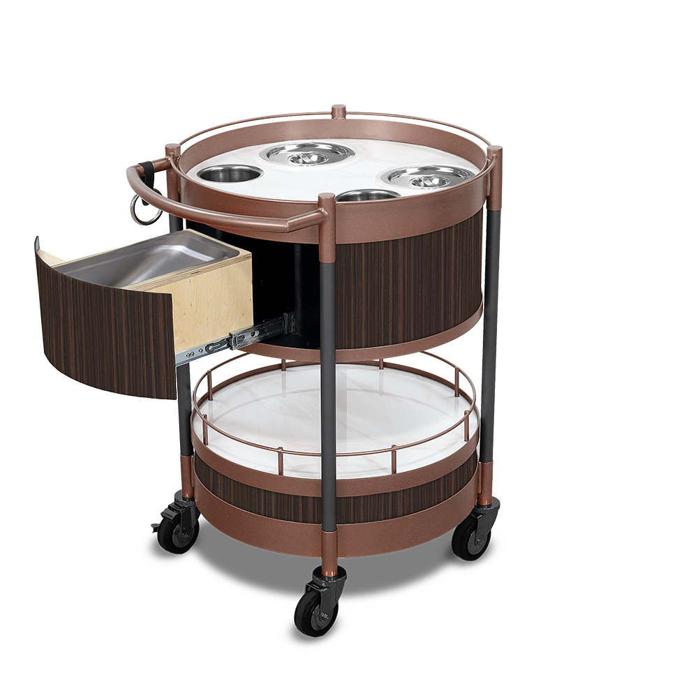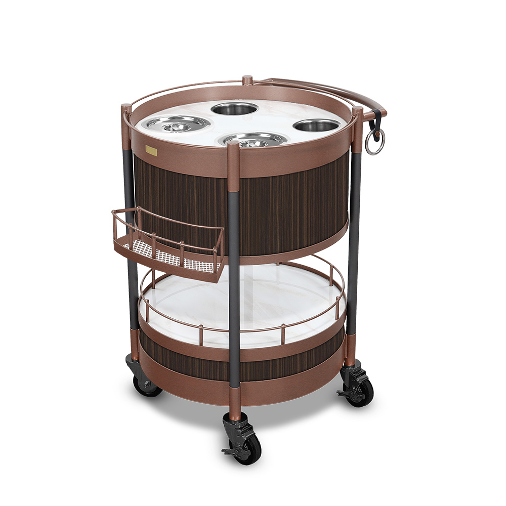 The Circa Bar Cart Executive with Mixology Top Kit blends sophistication with functionality, featuring a solid surface worktop, HPL finish, and a pull-out amenity drawer for seamless drink service. Designed for durability with Gunmetal Gray support posts, powder epoxy-painted framework, gallery rails, and sturdy casters, this luxury bar cart is ideal for high-end mixology and beverage presentation.