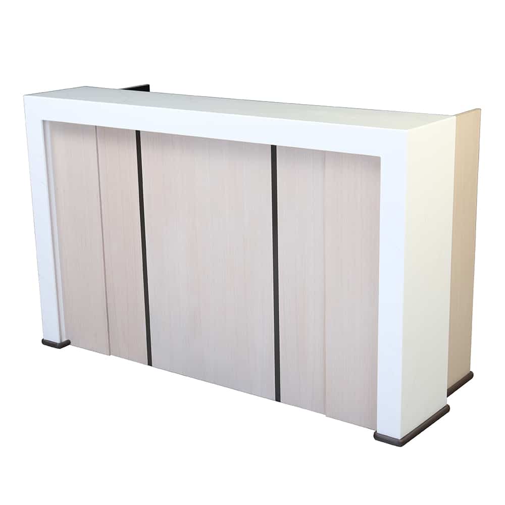 Hangover Mobile Bar (6 ft. length) H.P.L. cabinet with waterfall edge Avonite countertop, stainless steel sink (with drain) and two 18″ speed rail. Cabinet has two open sections each with three sets of glass rack rails, enclosed center cabinet with door, full wrap-around bumper and 5” gray wheels in all swivel casters. Overall Dimensions: 30″ W 75″ L x 48″ H.